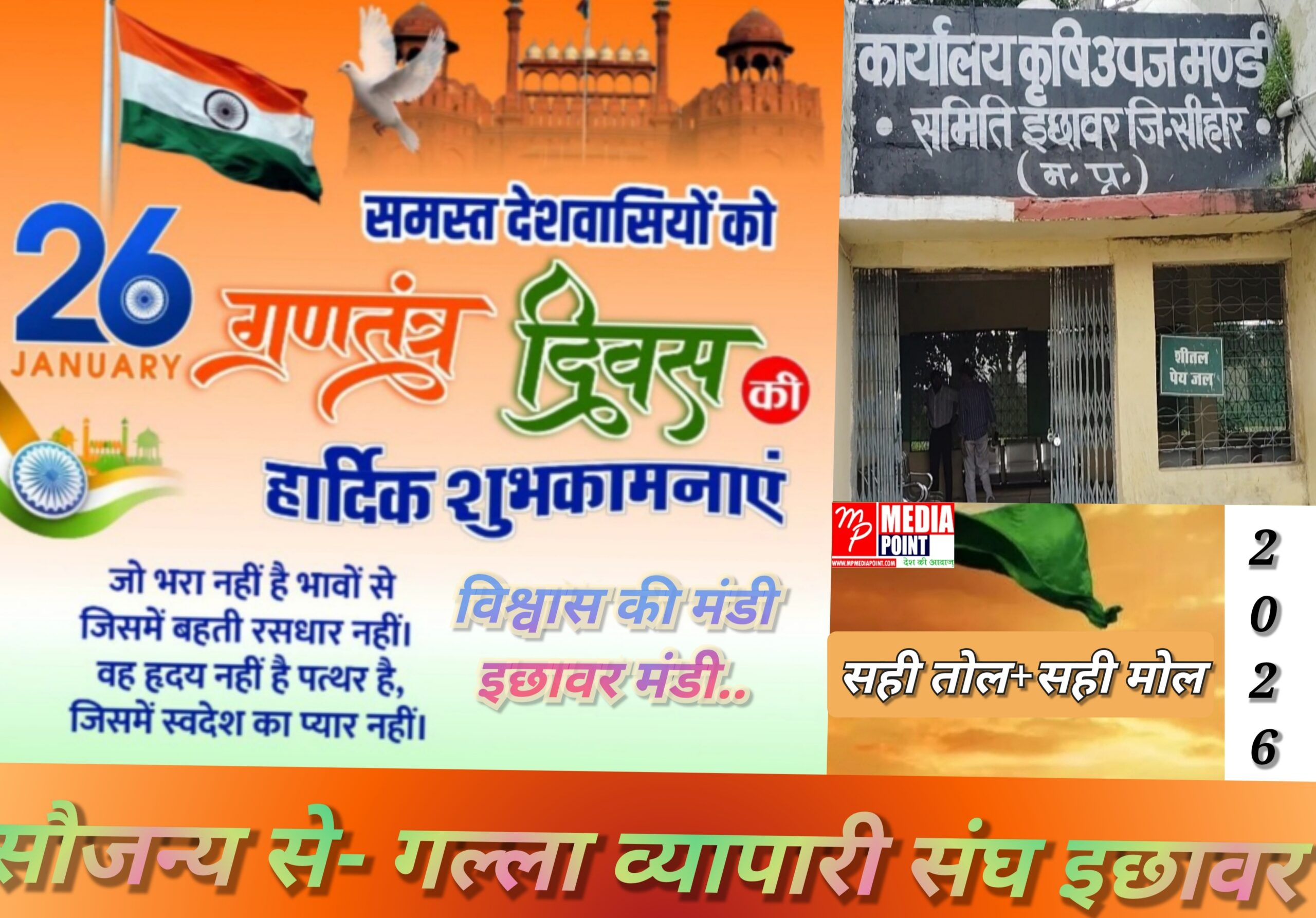 गणतंत्र दिवस- 2026 की धूमधाम, देशभक्ति, उत्साह,उमंग की लहर और चहल-पहल 25 जनवरी रात से ही शुरु हो गई, बधाई-शुभकामनाओं का आदान-प्रदान ब्लॉक मुख्यालय इछावर से लेकर पंचायतों तक जारी है। जनप्रतिनिधि,कलेक्टर बालागुरु के, सीईओ श्रीमती सर्जना यादव सहित विभागीय अधिकारियों,गणमान्य नागरिकों, सहित व्यापारी वर्ग ने भी अपने-अपने माध्यमों से शुभकामना संदेश प्रसारित किए। यह सिलसिला अभी जारी है और आगामी 24 घंटे जारी रहेगा….
